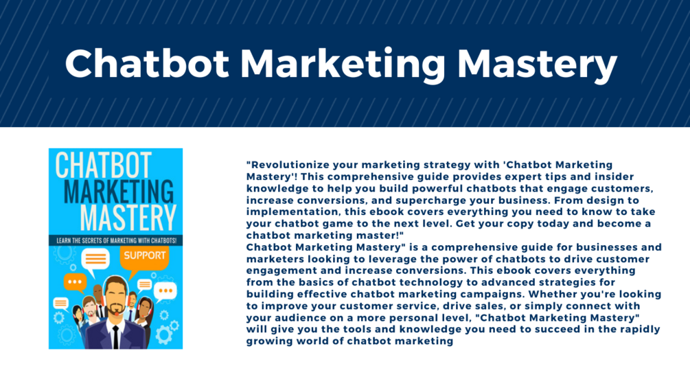 "Revolutionize your marketing strategy with 'Chatbot Marketing Mastery'! This comprehensive guide provides expert tips and insider knowledge to help you build powerful chatbots that engage customers, increase conversions, and supercharge your business. From design to implementation, this ebook covers everything you need to know to take your chatbot game to the next level. Get your copy today and become a chatbot marketing master!"