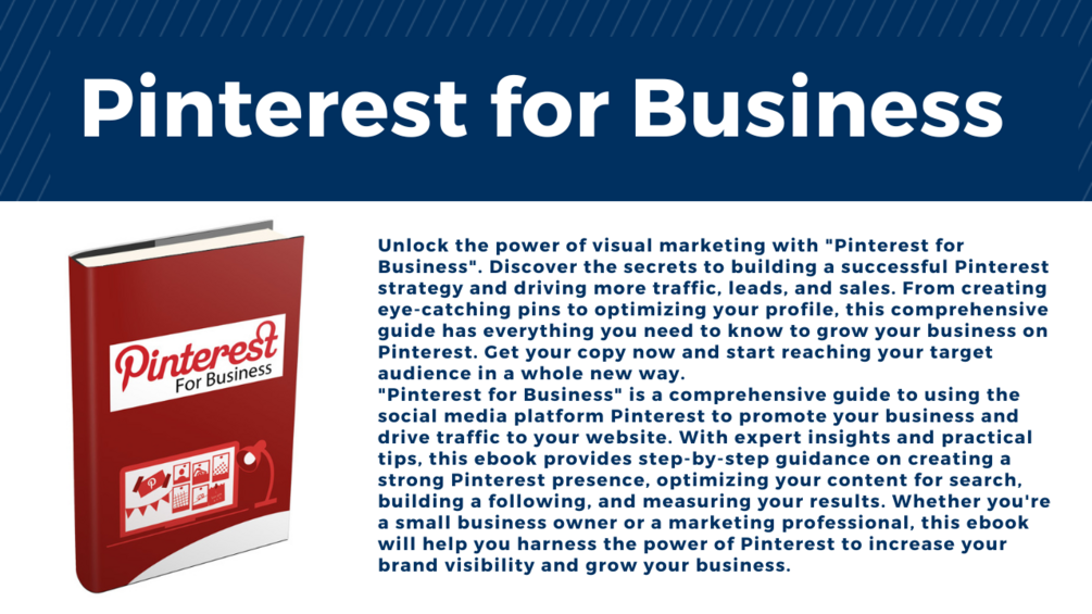 Unlock the power of visual marketing with "Pinterest for Business". Discover the secrets to building a successful Pinterest strategy and driving more traffic, leads, and sales. From creating eye-catching pins to optimizing your profile, this comprehensive guide has everything you need to know to grow your business on Pinterest. Get your copy now and start reaching your target audience in a whole new way.
